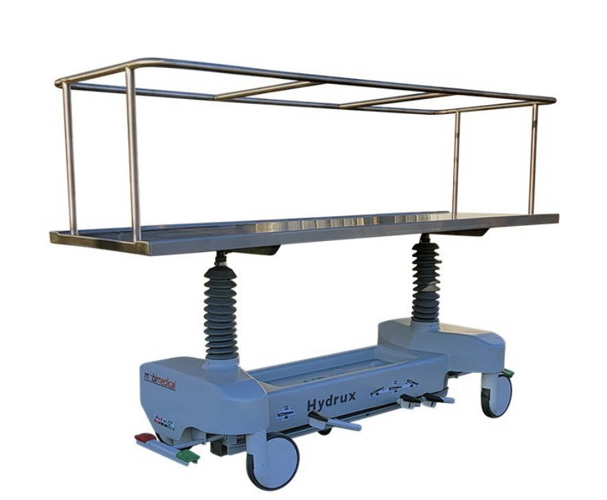 The MOBI Covered Cadaver Carrier is built specifically for inner facility hospital and mortuary use. The base is equipped with 8 inch center locking castors, has a center line fifth wheel for added control. Operating pedals are located on both sides, and is equipped with easy to use center locking brake. Top is built from heavy duty gauged 304 stainless steel, has a frame made from 304 stainless tubing that is light weight and easy to remove and install when in use. Static weight capacity of up to 800 lbs. Rolling weight capacity of 550 lbs.