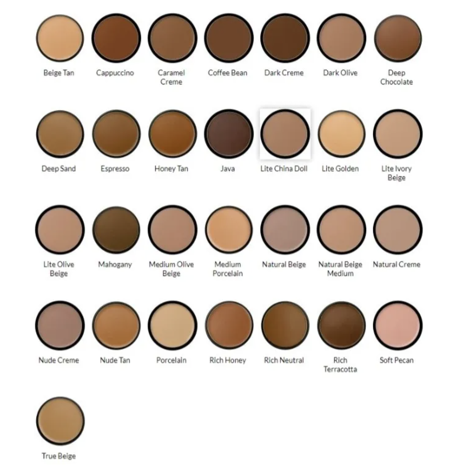 | Morticians Cover Creme | Beige Tan 6101, Cappuccino 6102, Carmel Creme 6103, Coffee Bean 6104, Dark Creme 6105, Dark Olive 6106, Deep Chocolate 6107, Deep Sand 6108, Espresso 6109, Honey Tan 6110, Java 6111, Light China Doll 6112, Light Golden 6113, Lite Ivory Beige 6114, Lite Olive Beige 6115, Mahoney 6116, Medium Olive Beige 6117, Medium Porcelain 6118, Natural Beige 6119, Natural Beige Medium 6120, Natural Creme 6121, Nude Creme 6122, Nude Tan 6123, Porcelain 6124, Rich Honey 6125, Rich Neutral 6126, Rich Terracotta 6127, Soft Pecan 6128, True Beige 6129 |