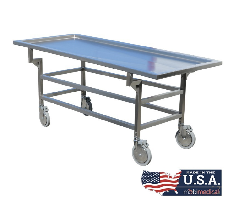 This table offers a 35†x 84†convex surface for easy fluid flow to the drain, located in center of foot end and 6†casters.