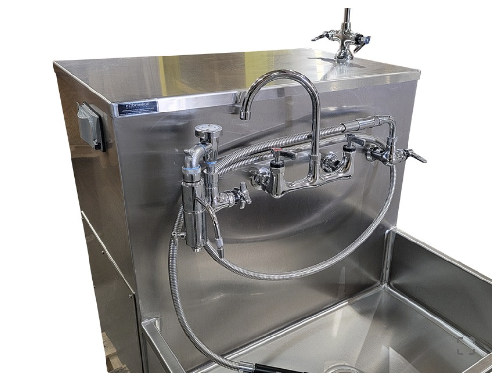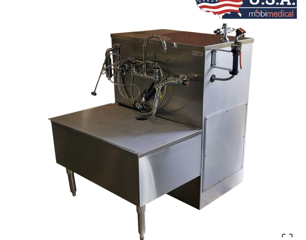 The MOBI-SSES Embalming station is constructed with 304 stainless steel and includes a large sink basin, hydro aspirator, and hot and cold water mixing faucet. Made in the USA.